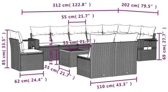 Delivery Contains: 1 x Corner seat, 7 x Center seats, 2 x Arm sofas, 1 x Garden table, 11 x Back cushions, 10 x Seat cushions