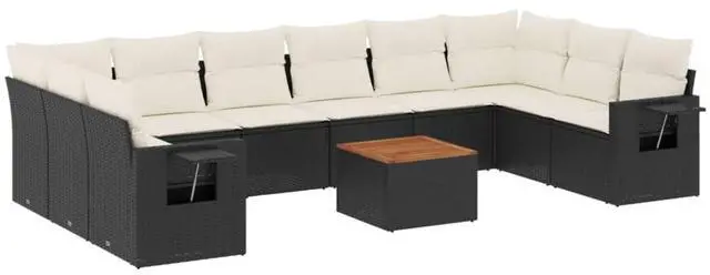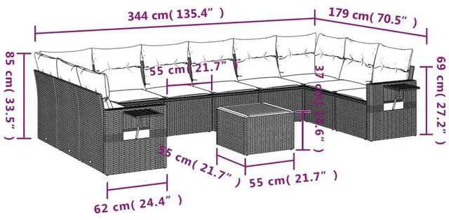 Delivery Contains: 2 Corner seats, 6 Center seats, 2 Arm sofas, 1 Garden table, 12 Back cushions, 10 Seat cushions