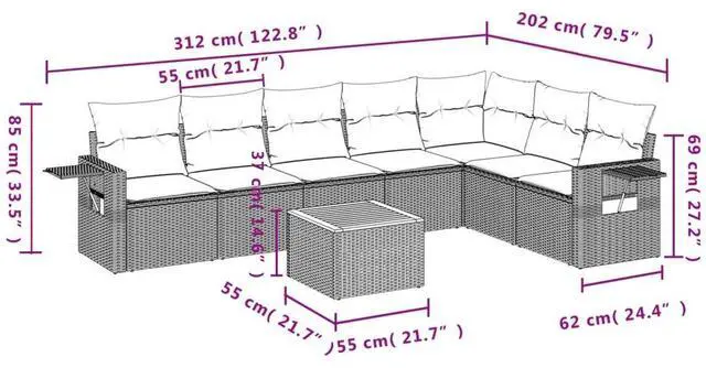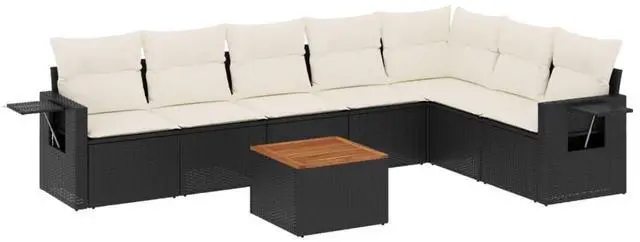 Delivery Contains: 1 x Corner Seat, 4 x Center Seat, 2 x Arm Sofa, 1 x Garden Table, 8 x Back Cushion, 7 x Seat Cushion