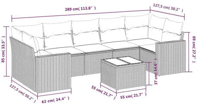 Delivery Contains: 2 Corner seats with storage, 3 Center seats with storage, 2 Arm sofas with storage, 1 Garden table, 9 Back cushions, 7 Seat cushions