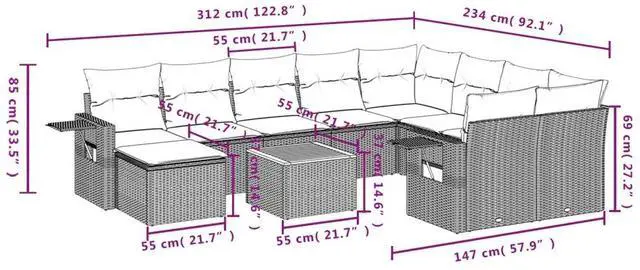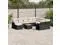 Delivery Contains: 2 Corner seats, 5 Center seats, 2 Arm sofas, 1 Footstool, 1 Garden table, 11 Back cushions, 10 Seat cushions