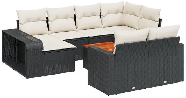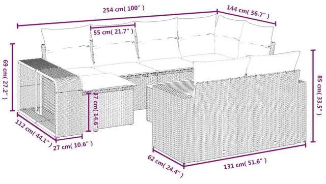 Delivery Contains: 1 x Corner seat with storage function waterproof bag, 4 x Centre seats with storage function waterproof bag, 2 x Arm sofas with storage function waterproof bag, 1 x Footstool with storage function waterproof bag, 1 x Garden table, 2 x Storage shelves, 8 x Back cushions, 8 x Seat cushions with removable covers