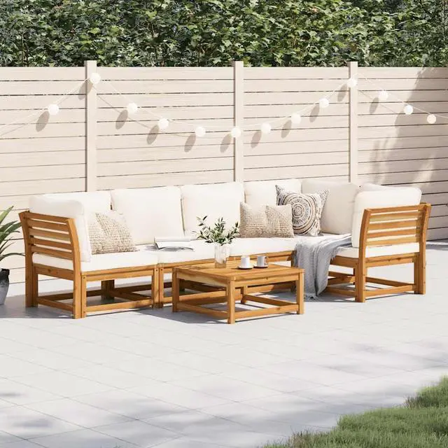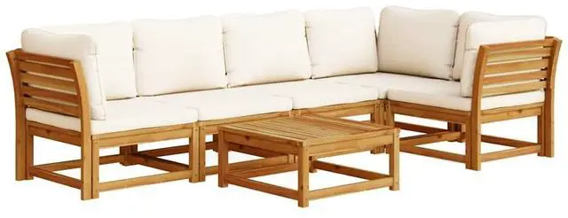 This 6-Piece Outdoor Modular Sofa Set enhances your patio or garden with its trendy design. Made of solid acacia wood, it looks great and is comfy, thanks to the soft cushions. Perfect for chilling with mates and family outdoors.