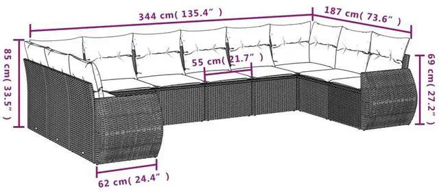 Delivery Contains: 2 x Corner seat, 6 x Center seat, 2 x Arm sofa, 1 x Garden table, 12 x Back cushion, 10 x Seat cushion