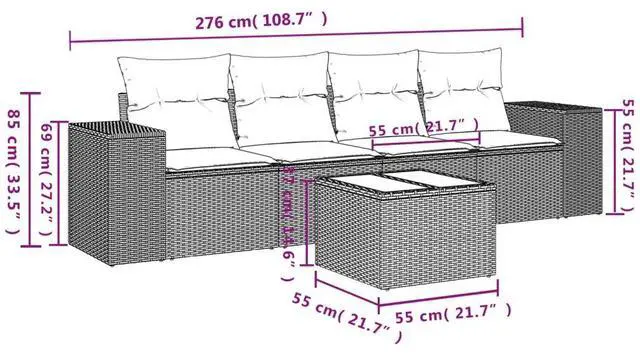 Delivery Contains: 2 x Centre seat, 2 x Arm sofa, 1 x Garden table, 4 x Back cushion, 4 x Seat cushion