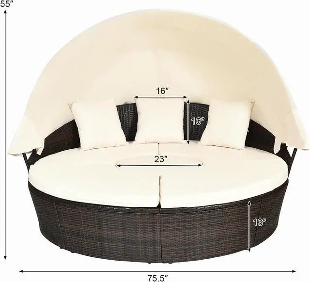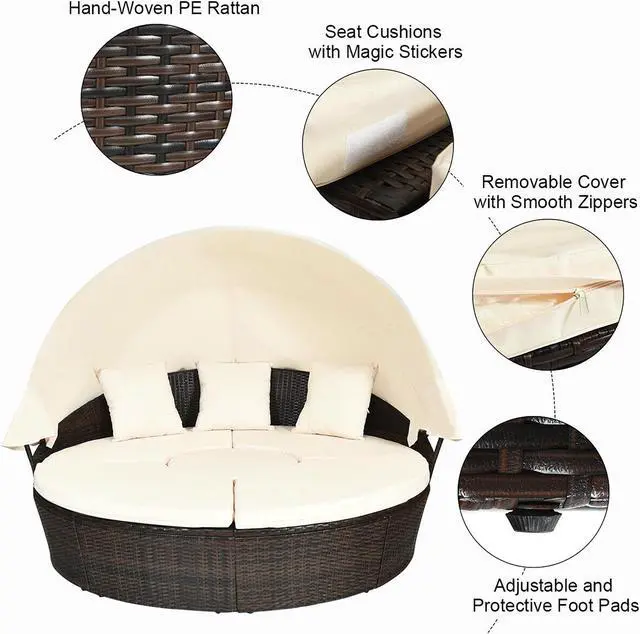 Are you looking for a comfortable and practical patio round daybed with canopy? If so, this one is highly recommended to you. The most stylish rattan wicker furniture gives your garden a new look. Our patio rattan daybed includes 1 round table, 2 fan-shaped footstools and 1 fan-shaped lounge chair. With its modern and upscale design, It will highlight your outdoor living space. The patio daybed is made of high-quality PE rattan and steel frame to provide stability and durability. Moreover, it comes with soft cushion and cozy pillows to ensure softness and comfortable seating experience. Comes with retractable canopy, which is made of water-proof and sun-resistant polyester fabric, the daybed can protect you from sunlight. Even better, the patio daybed with adjustable coffee table can be rearranged to meet your different demands. This is the perfect leisure option for patios, porches, pool side or garden areas.
