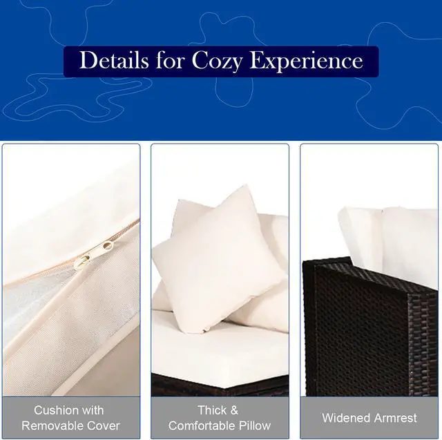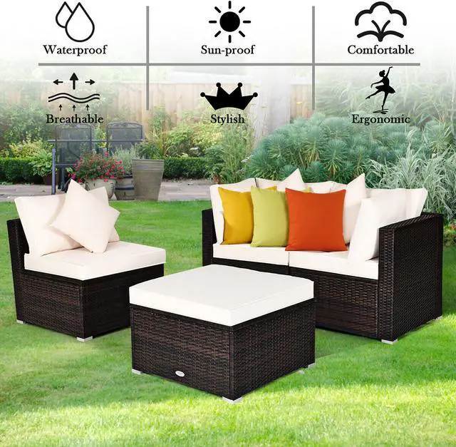Enjoy your leisure time on patio or backyard with this 4-piece rattan sectional seating group! Our 4pcs rattan sofa set includes 2 corner sofas, 1 armless sofa and 1 ottoman and each piece in this set is founded on a sturdy steel inner frame and wrapped in hand-woven PE wicker in a brown hue. Each component of this set can be used individually or in combination, easily changed to different layouts and combinations based on your need. With 3 soft pillows and polyester fabric cushions, it ensures comfort and long-lasting use. Equipped with zippers, the covers of cushions are easy to remove and clean. And the chic design is perfect for your dining room, kitchen, garden, patio, poolside, porch and suited for 3-4 people to eat and talk.