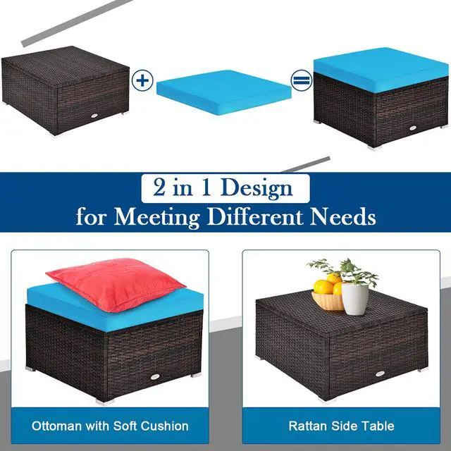 Our 4pcs rattan sofa set includes 2 corner sofas, 1 armless sofa and 1 ottoman. Each piece of this set can be used individually or in combination, easily changed to different distributions based on your need. Made of wear-resistant and waterproof PE wicker with a sturdy steel frame, this sofa set is easy to clean and can well stand the test of time. Thick and high-density sponge padded cushions and pillows provide a super comfortable outdoor seating area for you. Equipped with zippers, the covers of cushions are easy to remove and clean. Besides, this chic wicker furniture is perfect for any outdoor space including yards, patios, gardens, porches or indoors if you want.