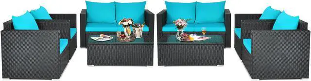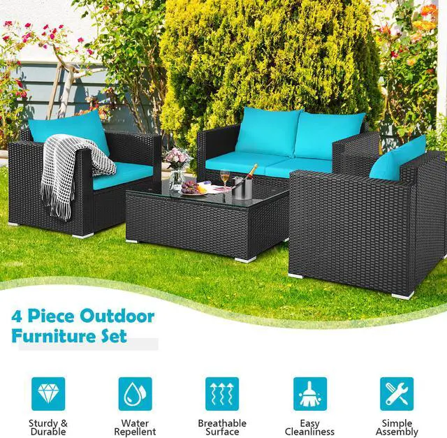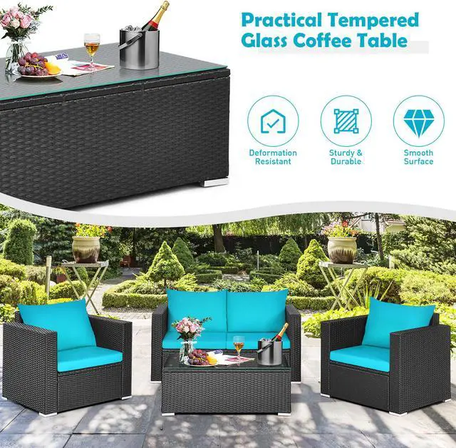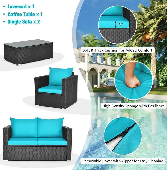 Because of the soft seat and back cushions, this outdoor sofa set can provide you with comfortable sitting experience. Widened armrests relax your arms and provide better support for your body. The frame is made of powder-coated steel and sturdy PE rattan wicker, which is sturdy enough to ensure a long lifespan. Aluminum foot pads at the bottom enhance the stability. Besides, the rattan table is equipped with a tempered glass tabletop, which is convenient for you to placing some drinks and fruits on it. If the cushion gets dirty, you can simply zip off the cushion cover and wash it.