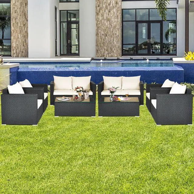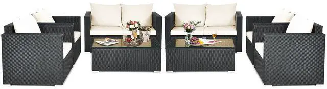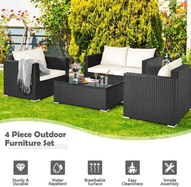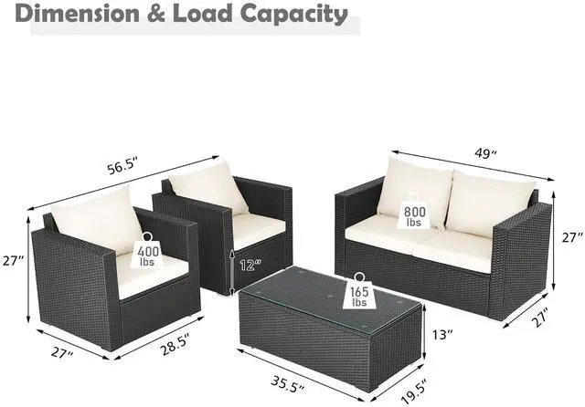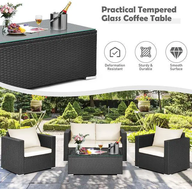 Because of the soft seat and back cushions, this outdoor sofa set can provide you with comfortable sitting experience. Widened armrests relax your arms and provide better support for your body. The frame is made of powder-coated steel and sturdy PE rattan wicker, which is sturdy enough to ensure a long lifespan. Aluminum foot pads at the bottom enhance the stability. Besides, the rattan table is equipped with a tempered glass tabletop, which is convenient for you to placing some drinks and fruits on it. If the cushion gets dirty, you can simply zip off the cushion cover and wash it.