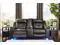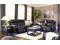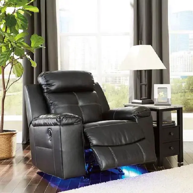 Contemporary reclining sofa with led lighting Love seat with console, storage and cup holder. Set includes a sofa, love seat with console and a recliner. Coffee table shown in the image not included. Color: Black Material: Faux Leather
