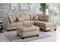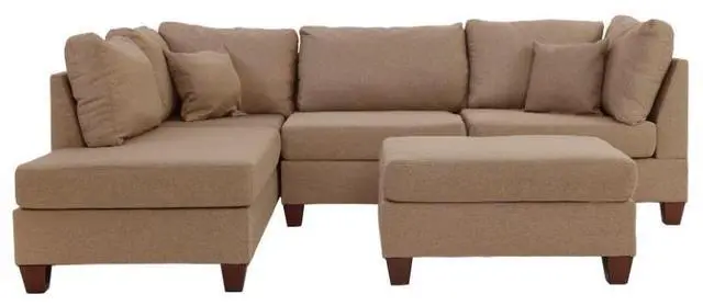 3-piece sectional with a matching ottoman. Upholstered in a plush linen-like fabric features cushioned pillow back and seat supports for maximum comfort. Materials: Sand Polyfiber, Plywood and Solid Pine with Plastic Legs