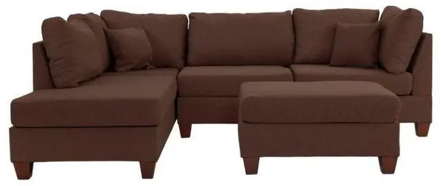 3-piece sectional with a matching ottoman. Upholstered in a plush linen-like fabric. Features cushioned pillow back and seat supports for maximum comfort. Materials: Chocolate Polyfiber Plywood and Solid Pine with Plastic Legs.