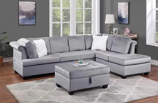Valenca Grey 3 Piece Sectional with Storage Ottoman Upholstered in Velvet