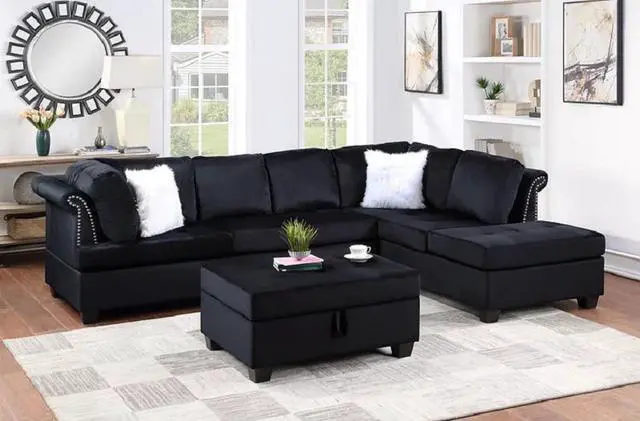 Valenca Black 3 Piece Sectional with Storage Ottoman Upholstered in Velvet