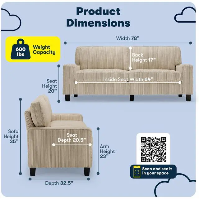 Offering big comfort in a small footprint, this two-person sofa couch is an ideal choice for compact spaces such as apartments, offices, or dorm rooms. The overall dimensions of the sofa measure 78 inches wide by 32-1/2 inches deep, with interior seat dimensions that measure 20 inches high by 64 inches wide with a seat depth of 20-1/2 inches.