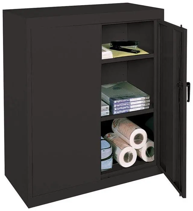 When functionality matters most, choose the Realspace steel storage cabinet. Organize books, craft materials and office supplies along the adjustable shelves, and keep it all secure with the door lock. This cabinet works well for a home, school or office space and complements most any dAcor with a sleek, metal design. Solid steel construction. 2 adjustable shelves hold up to 100 lb each. Locking doors. Magnetic door catch. Meets andor exceeds ANSIBIFMA performance standards. Assembly required. cabinet with 2 adjustable shelves is 42 in height.