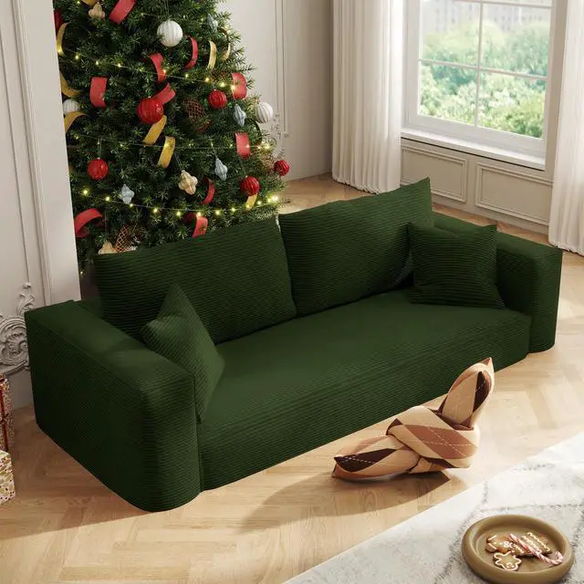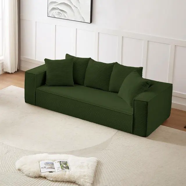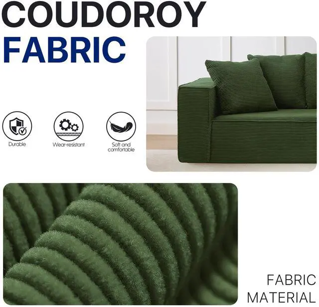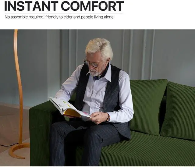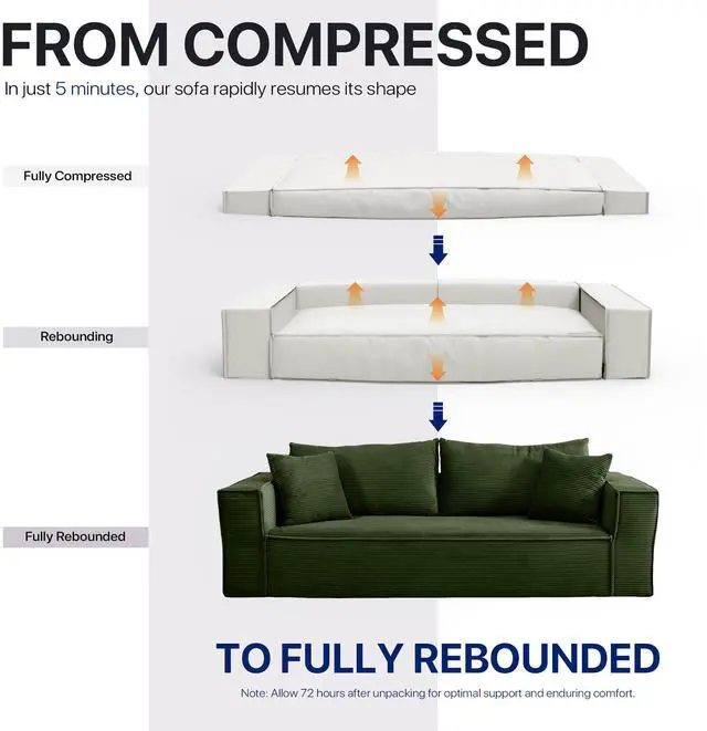 The Aukfa compressed sofa couch series features premium, wear-resistant corduroy fabric that offers a vibrant appearance, exceptional softness, and lasting durability, adding comfort and style to any living space. Filled with high-density pure sponge, it provides superior support compared to traditional spring sofas, ensuring long-lasting firmness without sagging. The sofa arrives compressed, and any fabric wrinkles caused during shipping will smooth out naturally as it expands, typically regaining its full shape and firmness within 24 to 72 hours. Light ironing can help accelerate this process, though the sofa is ready for immediate use right out of the box.