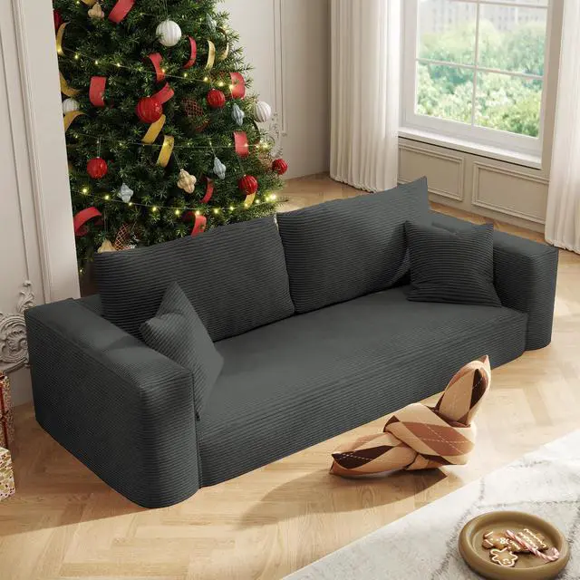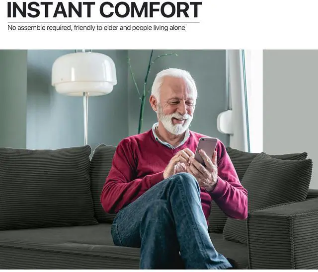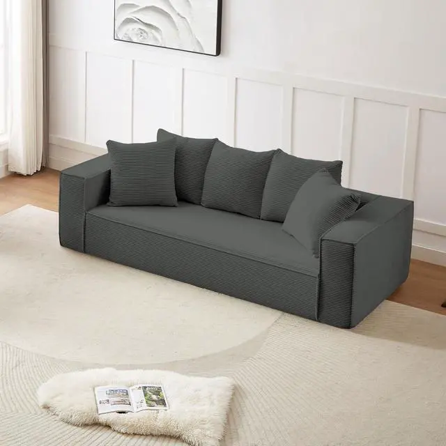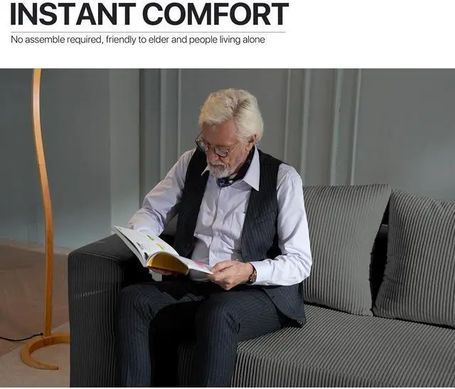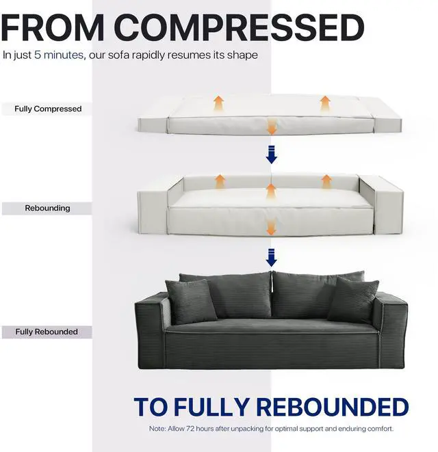 The Aukfa compressed sofa couch series features premium, wear-resistant corduroy fabric that offers a vibrant appearance, exceptional softness, and lasting durability, adding comfort and style to any living space. Filled with high-density pure sponge, it provides superior support compared to traditional spring sofas, ensuring long-lasting firmness without sagging. The sofa arrives compressed, and any fabric wrinkles caused during shipping will smooth out naturally as it expands, typically regaining its full shape and firmness within 24 to 72 hours. Light ironing can help accelerate this process, though the sofa is ready for immediate use right out of the box.