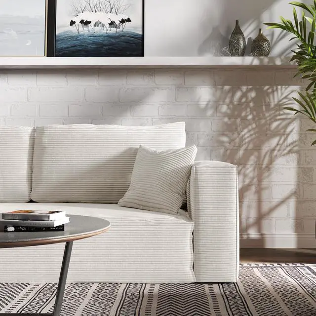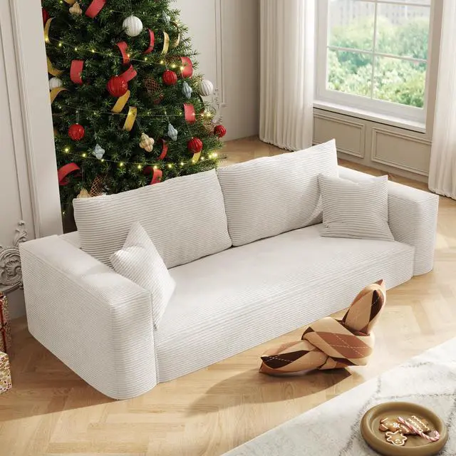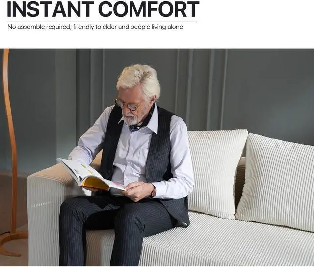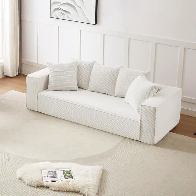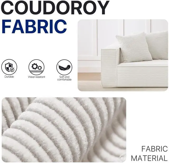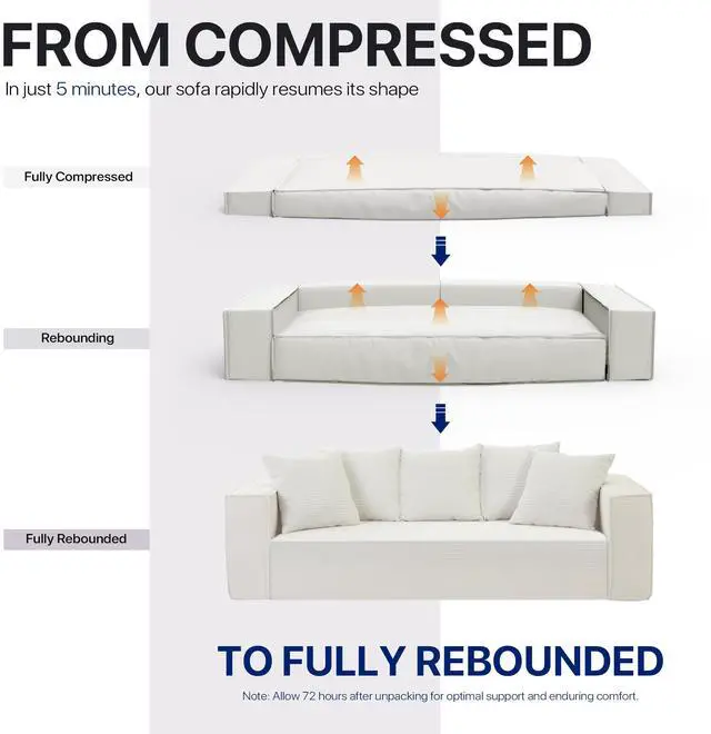 The Aukfa compressed sofa couch series features premium, wear-resistant corduroy fabric that offers a vibrant appearance, exceptional softness, and lasting durability, adding comfort and style to any living space. Filled with high-density pure sponge, it provides superior support compared to traditional spring sofas, ensuring long-lasting firmness without sagging. The sofa arrives compressed, and any fabric wrinkles caused during shipping will smooth out naturally as it expands, typically regaining its full shape and firmness within 24 to 72 hours. Light ironing can help accelerate this process, though the sofa is ready for immediate use right out of the box.