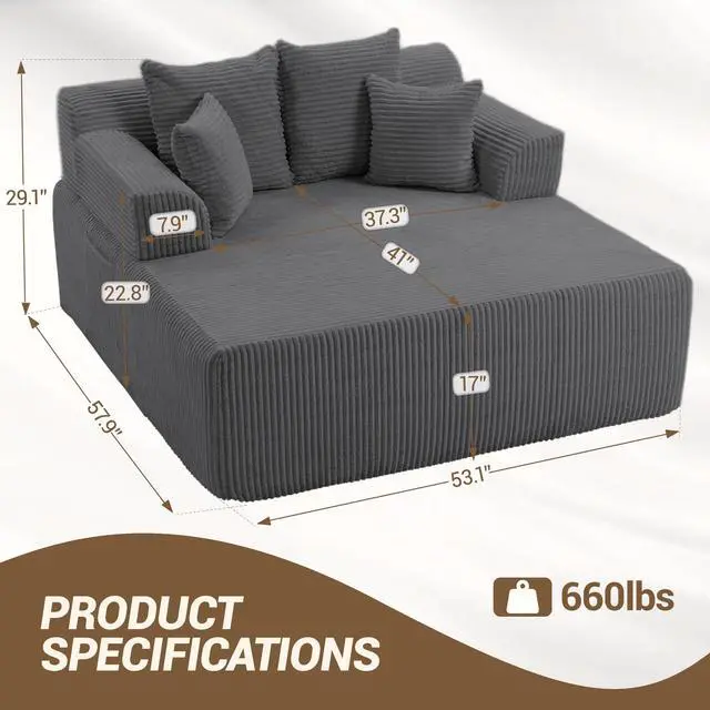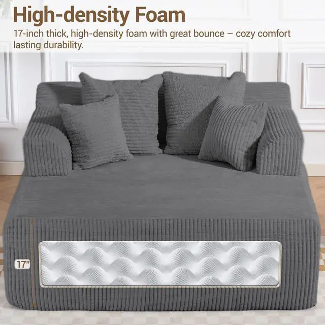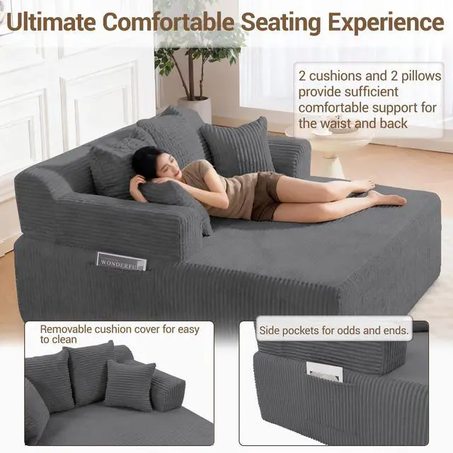 As an oversized sleeper sofa bed, it stands out with an extra-deep 41.3" seat, letting you effortlessly find your ideal position for utmost comfort, perfect for all-day lounging. It even adds thoughtful convenience: built-in fabric side pockets, perfectly sized for stowing books, tablets, or magazines, so your go-to reading essentials stay within arm's reach without cluttering the space. Its 8" wide armrests also pull double duty, offering spots to rest your arms or set mugs and decor, making it a perfect reading chair for adults who love to unwind with a novel. By day, it's a plush lounge chair for living room gatherings or solo relaxation; by night, it transforms into a temporary bed for guests, eliminating the need for a separate guest bed. And with 4 included corduroy accent pillows, every sit feels like sinking into a cloud, earning it the title of a true cloud sofa that blends comfort with practicality.