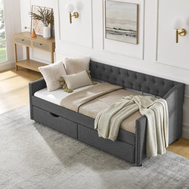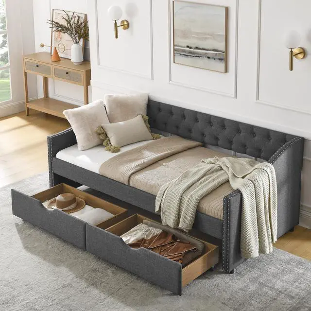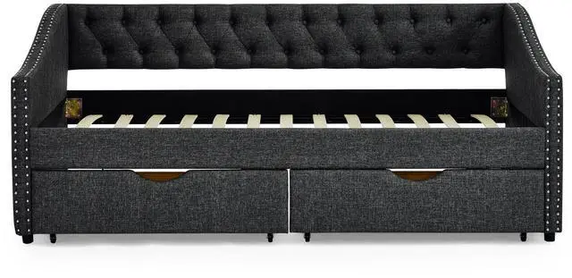 [Functional Trundle] This exceptional piece of living room furniture is manufactured to meet your needs, allowing the cozy bed to not only afford a comfortable seating experience but also two drawers under the bed provide storage function. Reinforced Frame. The frame of this daybed with drawers is crafted from a combination of eucalyptus wood and MDF board to effortlessly hold up to 500lbs.