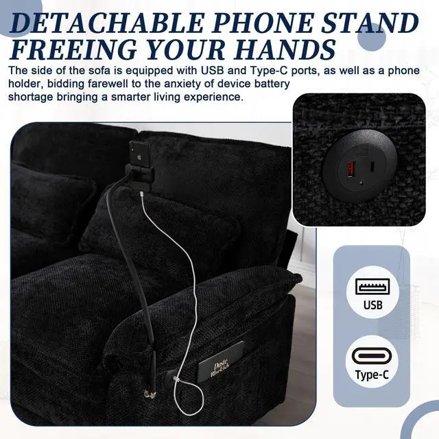 Made for ConvenienceThe sofa is equipped with a built-in charging interface: 1 USB+1 Type-C, and comes with a phone holder. This design enables convenient charging of devices while making mobile phones within reach, perfectly integrating functionality with modern convenience and bringing a smarter living experience.