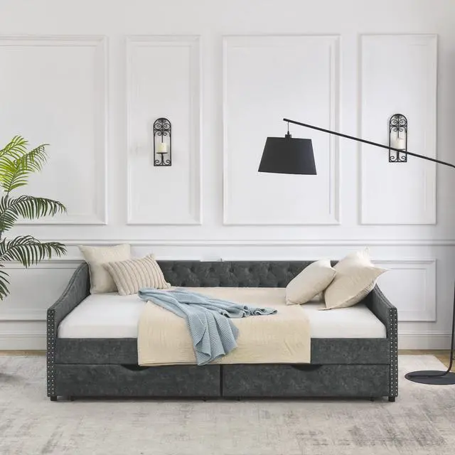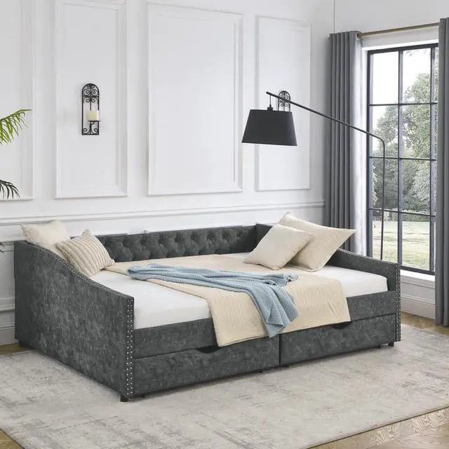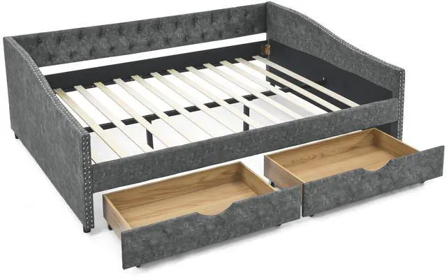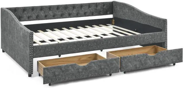 • Queen Size Daybed with Drawers Upholstered Tufted Sofa Bed,,with Button on Back and Copper Nail on Waved Shape Arms, Grey (84.5"x63.5"x26.5")