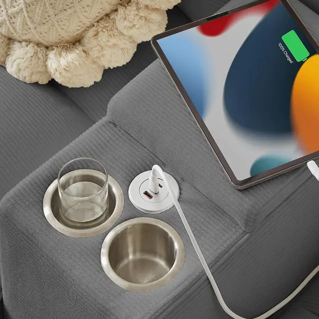 Console with storage cabinets, cup holders, and an ashtray allows for casual placement of beverages and teas while also providing extra storage space for personal items, perfect for watching TV or entertaining guests.