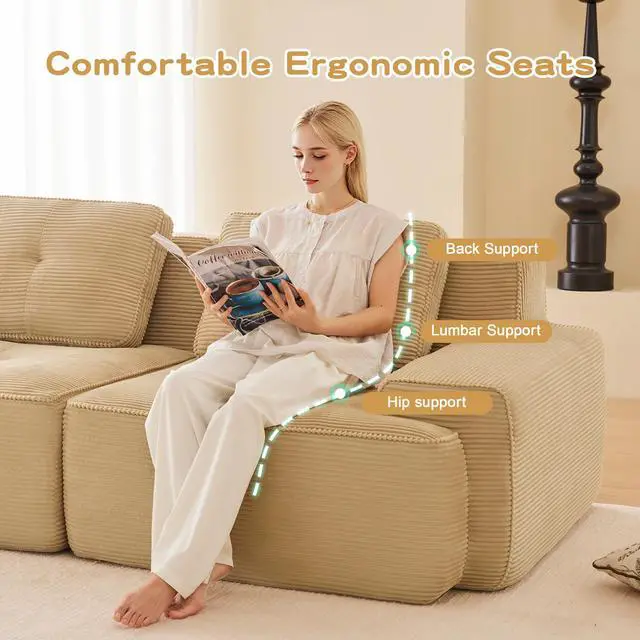 Ergonomic design: This sofa features an ergonomic curved design with a seat crafted from 32D high-resilience sponge, offering rapid rebound and exceptional durability. Paired with skin-friendly, breathable, and wear-resistant corduroy fabric, it delivers cloud-like comfort. The extra-wide and deep seat design, fatigue-free extended sitting. Every time you lean back, it adapts to your body like it was made just for you.
