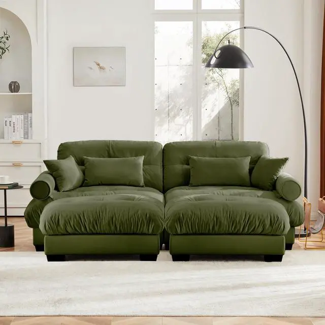 • Over Size Modern Two-seater Sofa with Ottoman, Velvet 2-Seater with Round Bolster Armrests,With Waist Pillow and Throw Pillows, Reading Room Olive green