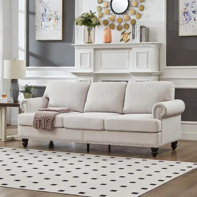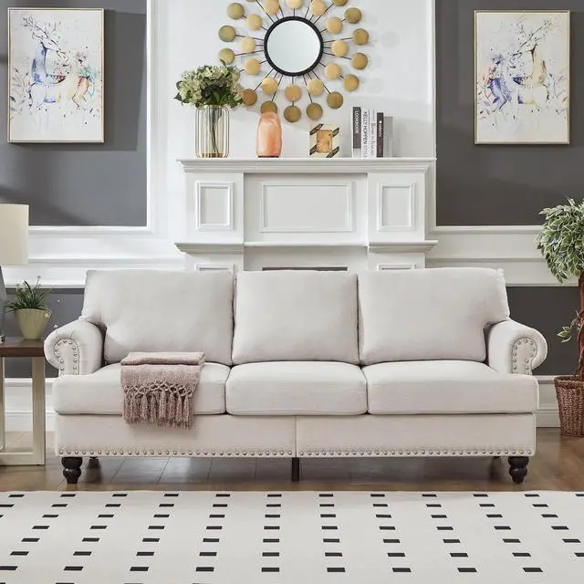 • 83" Modern Classic Design with Nails Living Room Three Seater Sofa Fabric Couch,Upholstered Polyester Beige.