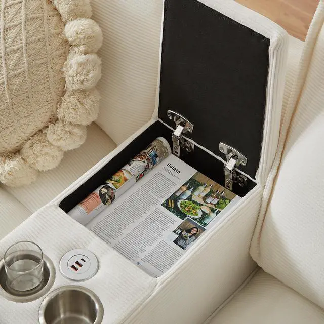 Console with storage cabinets, cup holders, and an ashtray allows for casual placement of beverages and teas while also providing extra storage space for personal items, perfect for watching TV or entertaining guests.