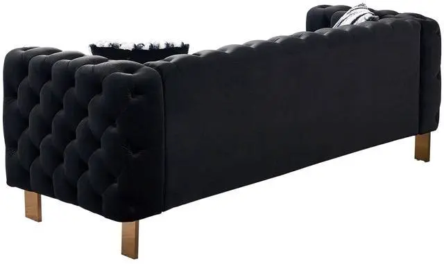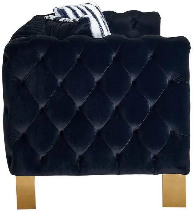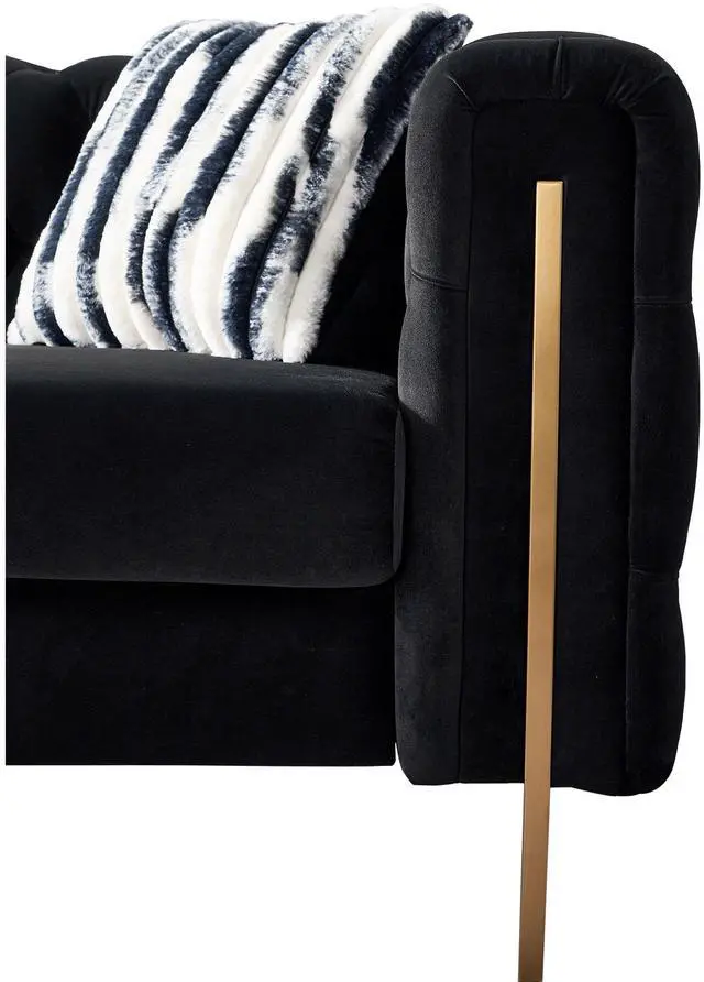Our velvet couch features velvet button tufting along the back and around the sides. The striking gold metal legs are more than a background feature, extending into the arms.
