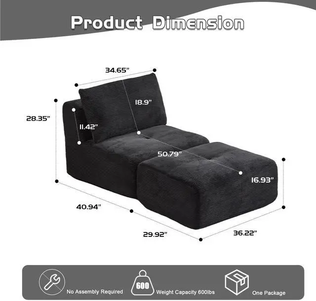 • Modern Memory Foam Compressed Sofa,Single Chaise Longue for Living Room,Pet-Friendly Cloud Modular Sectional Sofa,Corduroy Fabric,Movable Ottoman,No Assembly required,Black