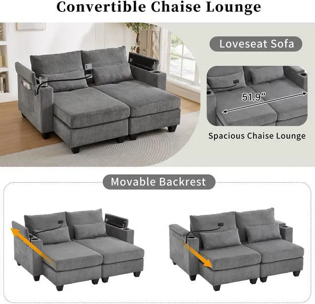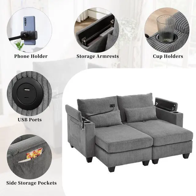 • Convertible Chaise Lounge 63" Loveseat Sofa Sofa Bed Corduroy Sleeper Sofa with USB Ports , Two Cup Holders, A Phone Holder and Ample Storage Space for Living Room and Bedroom, Grey