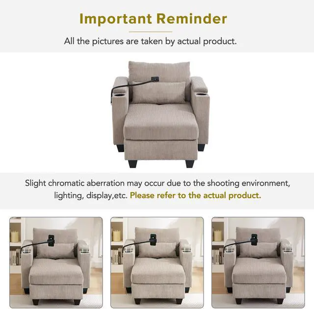 Multi-Functional Armrests Both left and right armrests are thoughtfully designed to serve multiple functions. Each includes a hidden storage compartment, perfect for storing remote controls, chargers, reading glasses, or snacks. Additionally, integrated cup holders keep beverages secure and within arms reach, making it perfect for movie nights or casual lounging.