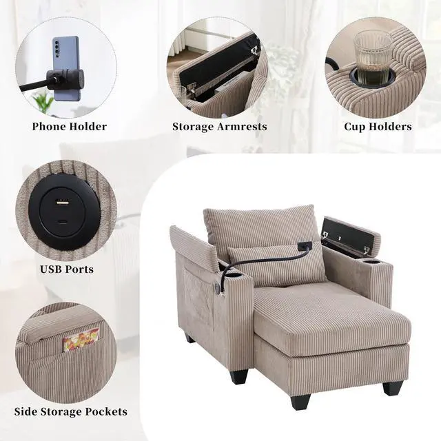 • Convertible Chaise Lounge 37.4" Sofa Chair Sofa Bed Corduroy Sleeper Sofa with USB Ports , Two Cup Holders, Phone Holder and Ample Storage Space for Living Room and Bedroom, Brown