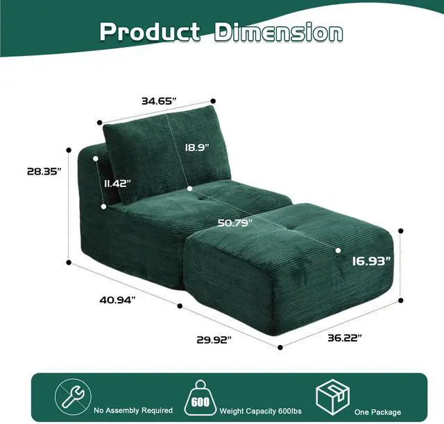 • Modern Memory Foam Compressed Sofa,Single Chaise Longue for Living Room,Pet-Friendly Cloud Modular Sectional Sofa,Corduroy Fabric,Movable Ottoman,No Assembly required,Green