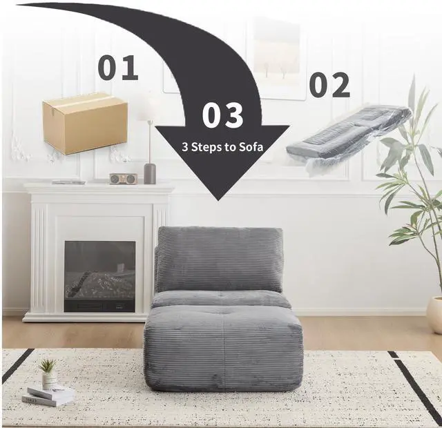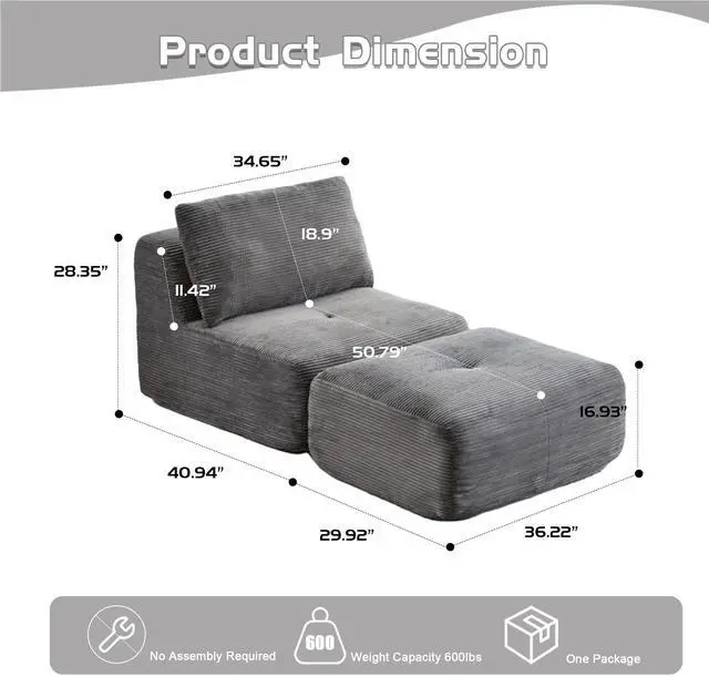 • Modern Memory Foam Compressed Sofa,Single Chaise Longue for Living Room,Pet-Friendly Cloud Modular Sectional Sofa,Corduroy Fabric,Movable Ottoman,No Assembly required,Grey