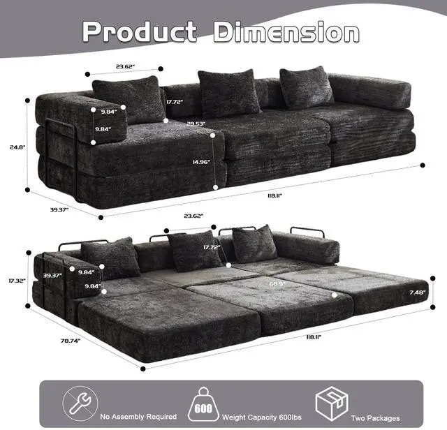 Tips: It takes time for the convertible sofa bed to expand, once you opened it as the cushions are packed in a compressed state; in general cases, it will take approximately 72-96 hours to expand.