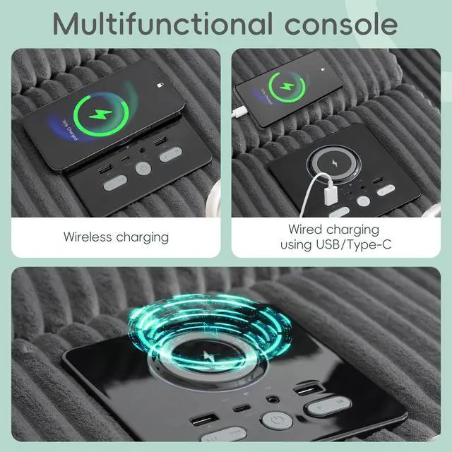 Wired&Wireless Charging Ports: With integrated wired and wireless charging options, you can conveniently charge your smartphone, tablet, or other devices while relaxing, without the hassle of extra cords or adapters. Enjoy uninterrupted entertainment without leaving your seat.