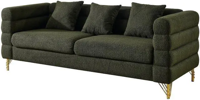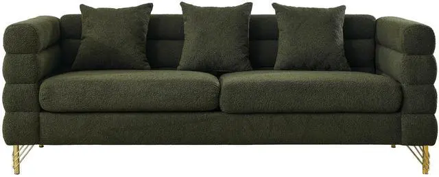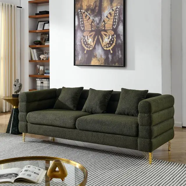 DURABLE: The sofa is supported by solid wood frame and sturdy gold polished metal legs, this modern three seater living room sofa is strong and durable. Each seat can easily hold up to 250 pounds, making it ideal for three people to relax.