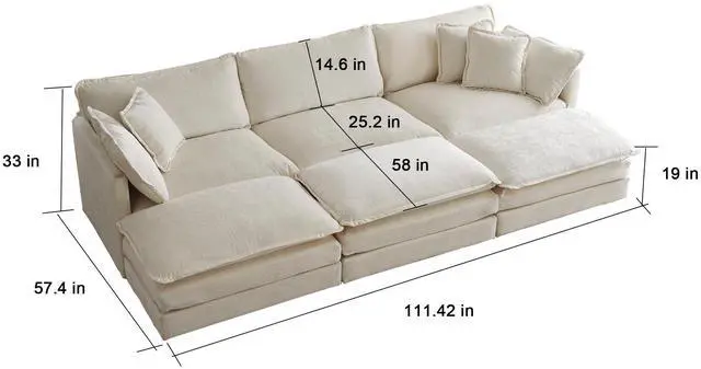 Dimensions - Overall size 111.42" x 57.44" x 33" Ht, 3 Seat Sofa size 111.42 W x 35 D x 33 H (inches), Ottoman size 37 W x 22.44 D x 18.5 H (inches), medium duty of the modular couch is enough to support 3 adults.