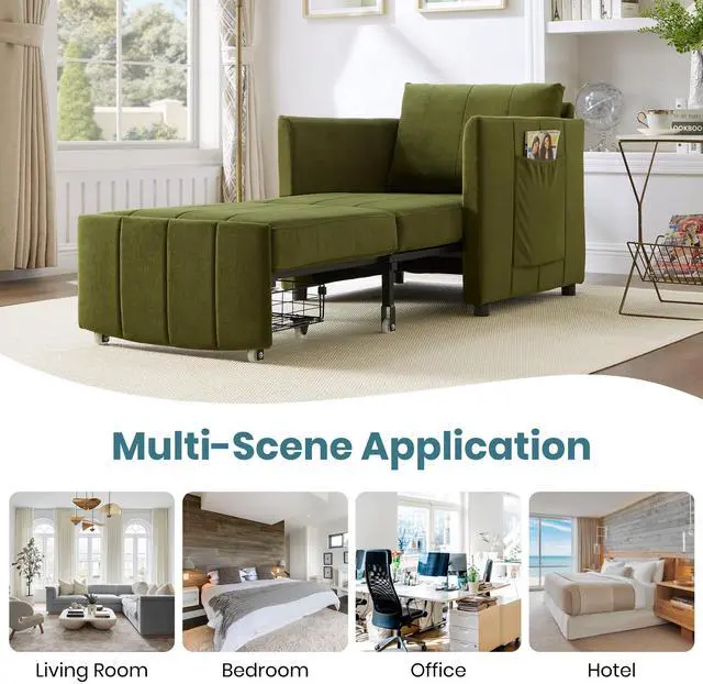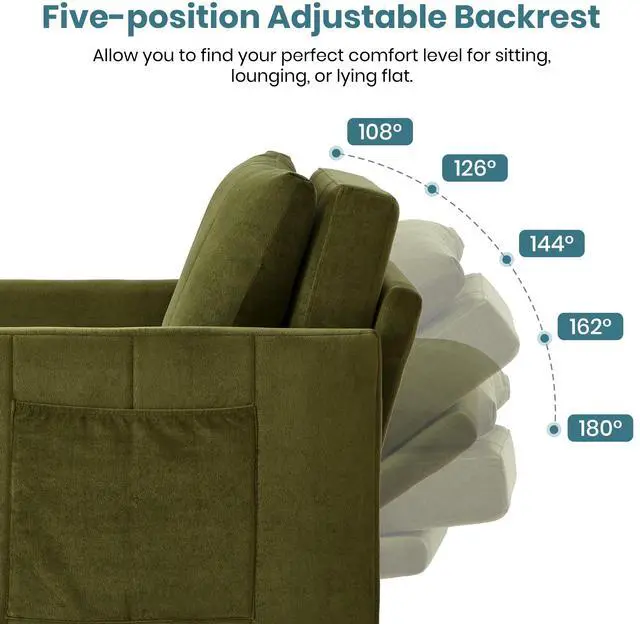 Five Adjustable Recline Positions - The backrest of this sofa bed features a unique five-position adjustable recline function(108°, 126°, 144°, 162°and 180°), allowing you to find your ideal angle of comfort. Whether you prefer to sit upright for reading or watching TV, or recline fully for a restful nap, the backrest can be easily adjusted to suit your preferences.