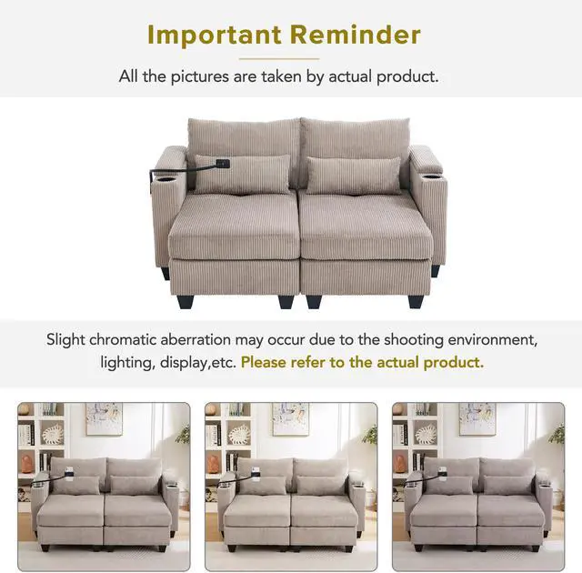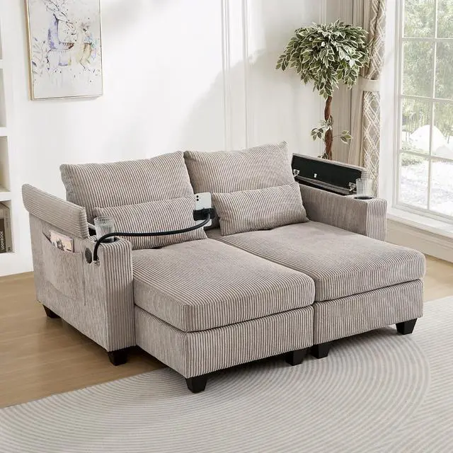 Multi-Functional Armrests Both left and right armrests are thoughtfully designed to serve multiple functions. Each includes a hidden storage compartment, perfect for storing remote controls, chargers, glasses, or snacks. Additionally, integrated cup holders keep beverages secure and within arms reach, making it perfect for movie nights or casual lounging.