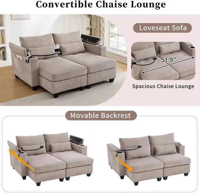 • Convertible Chaise Lounge 63" Loveseat Sofa Sofa Bed Corduroy Sleeper Sofa with USB Ports , Two Cup Holders, A Phone Holder and Ample Storage Space for Living Room and Bedroom, Brown