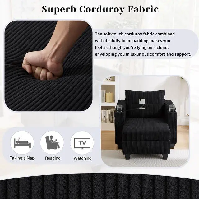 Convertible Chaise Lounge 37.4" Sofa Chair Sofa Bed Corduroy Sleeper Sofa with USB Ports , Two Cup Holders, Phone Holder and Ample Storage Space for Living Room and Bedroom, Black