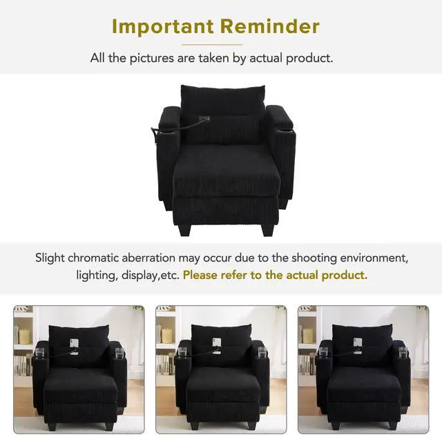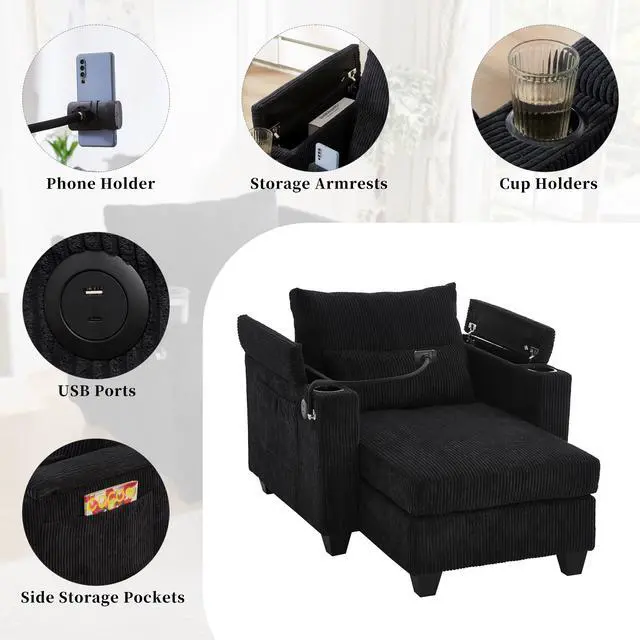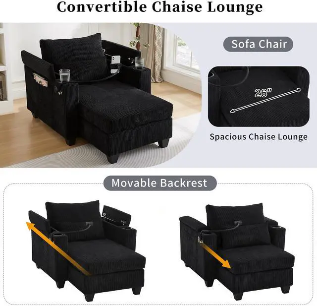• Convertible Chaise Lounge 37.4" Sofa Chair Sofa Bed Corduroy Sleeper Sofa with USB Ports , Two Cup Holders, Phone Holder and Ample Storage Space for Living Room and Bedroom, Black