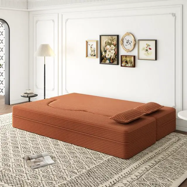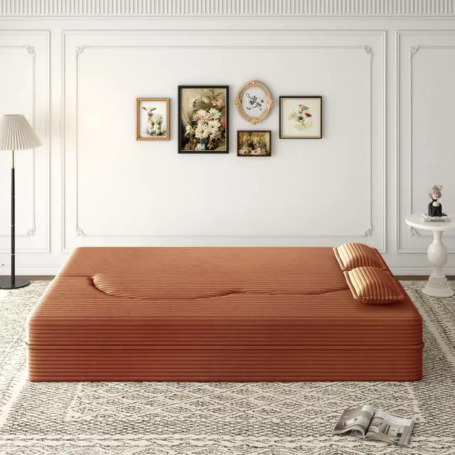 • Modern Floor Sofa with 2 Pillows,Convertible Plush Corduroy Foam-Filled Sleeper Sofa Bed,15" Full Size Folding Mattress for Living Room,Guest Bed,no assembly required,Orange
